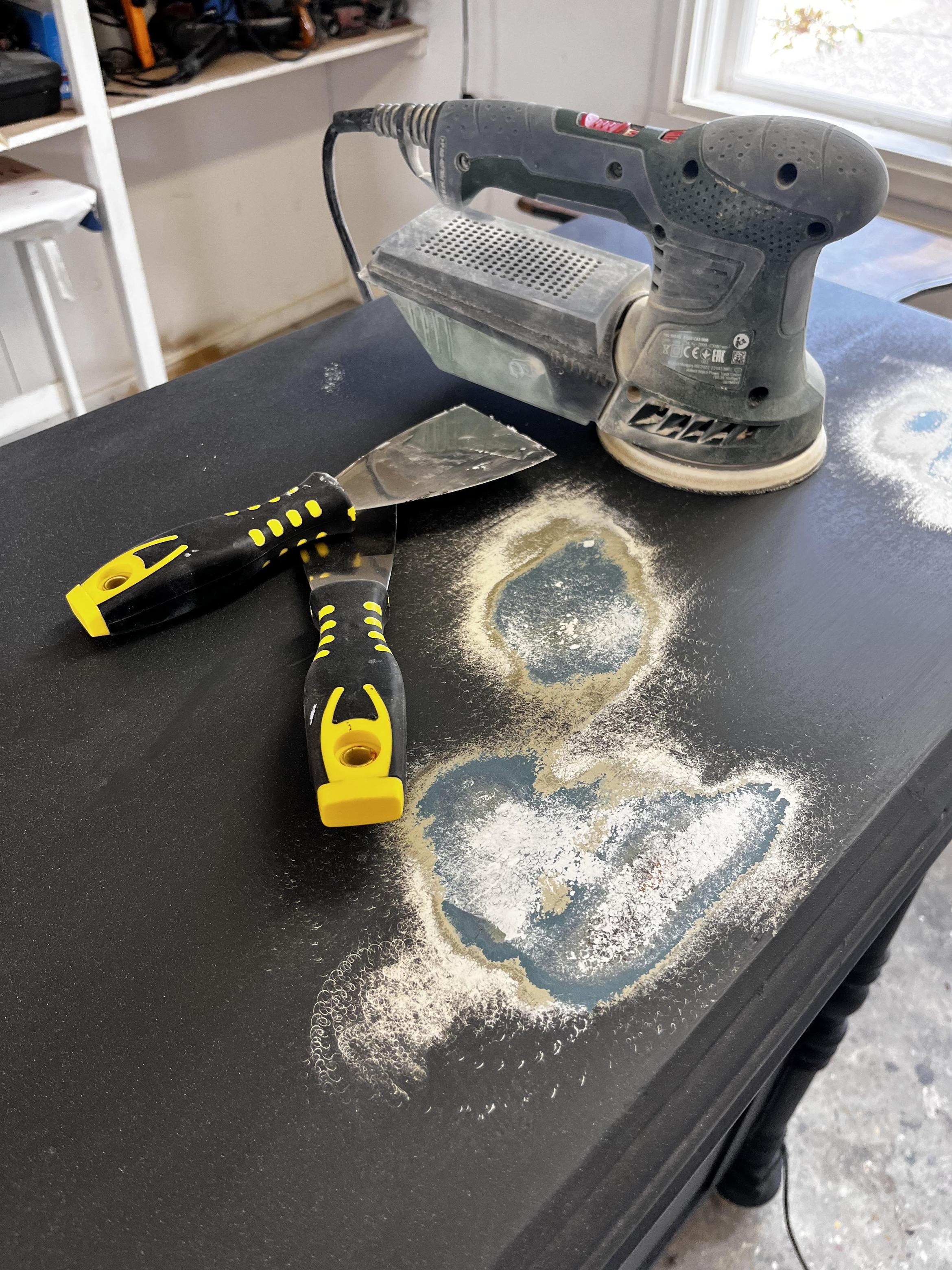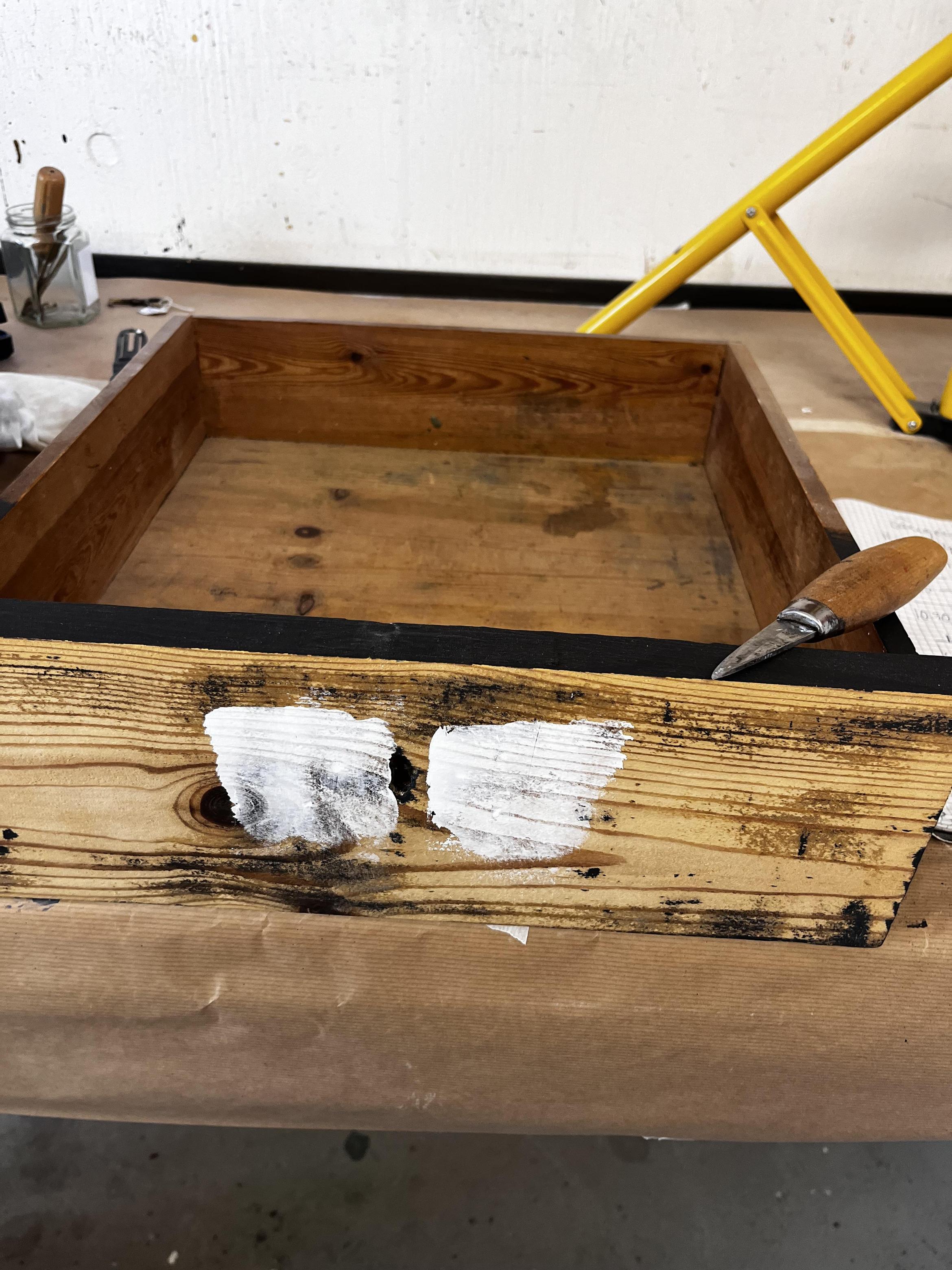 Möblerna tvättas, spacklas, slipas, grundmålas och lagas vid behov.